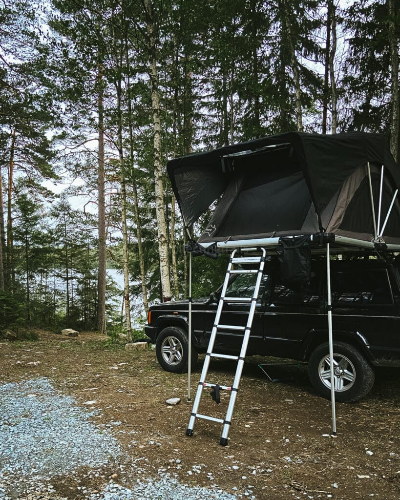 In Zweden geldt dan wel het allemansrecht, maar dat wil niet zeggen dat je echt overal mag kamperen. Zo ook niet bij het water waar wij ons avondeten hebben gemaakt. Voor de overnachting zijn we dus op zoek gegaan naar een andere plek. Uiteindelijk na wat zoeken op de kaart in onze OsmAnd-app vonden we een doodlopende weg het bos in. Aan de verse laag grof grind te zien was dit pad recent aangelegd voor de bosbouw. Op een mooie open plekje hebben we de auto recht gezet en ons daktent open geklapt.